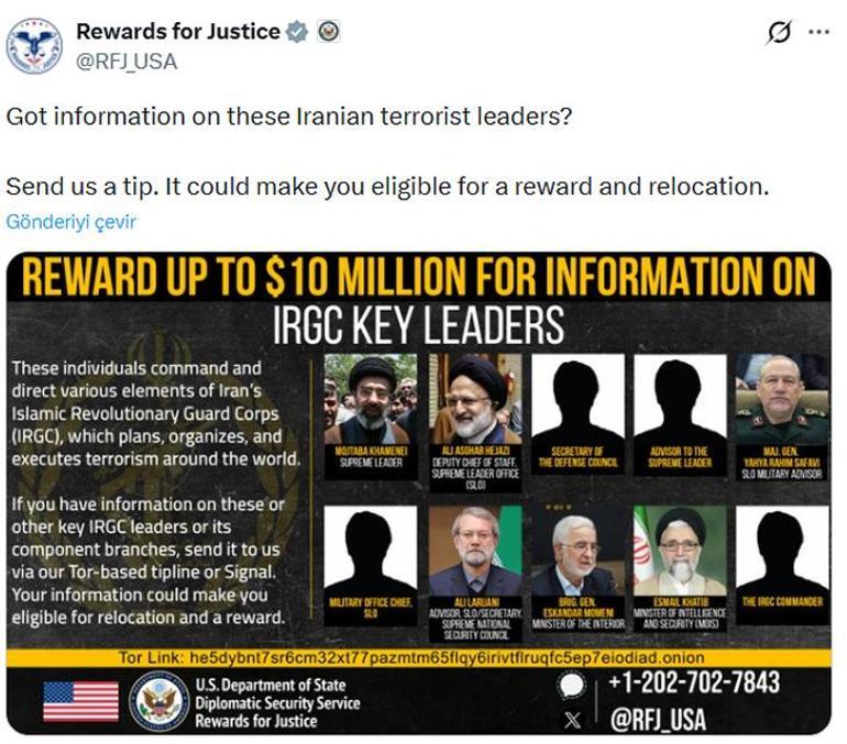 Daha önce İran Devrim Muhafızları Ordusu’nu “yabancı terör örgütü” olarak sınıflandıran Amerikan yönetimi, ABD Dışişleri Bakanlığının Adalet İçin Ödül Programı kapsamında, X hesabından paylaşım yaptı.