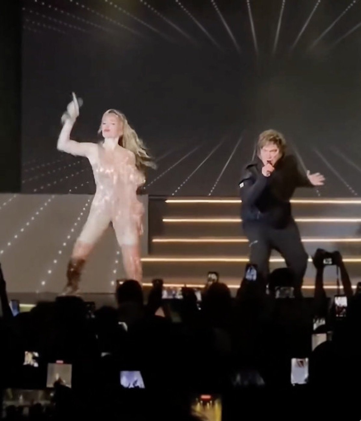Burada sahneye çıkan Milei, Florez’in eşliğine şarkı söyledi.