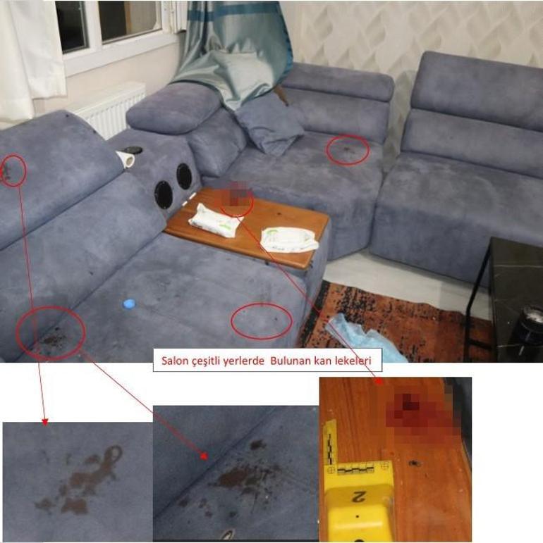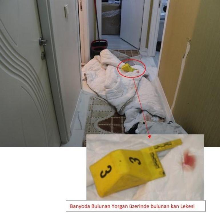 İddianamede, evin salonunda, çamaşır makinesi içindeki yorgan üzerinde ve yatak süngeri kenarında tespit edilen kan izlerinin maktule ait olduğunun saptandığı, ancak maktulün vücudunda yara veya kesi izine rastlanmaması nedeniyle evdeki kan lekeleriyle ölüm arasında doğrudan bir bağ kurulamadığı ifade edildi.