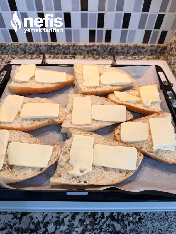 3. Kestiğimiz parça bayat ekmeklerimizi içine yağlı kağıt serdiğimiz bir fırın tepsimize diziyoruz.