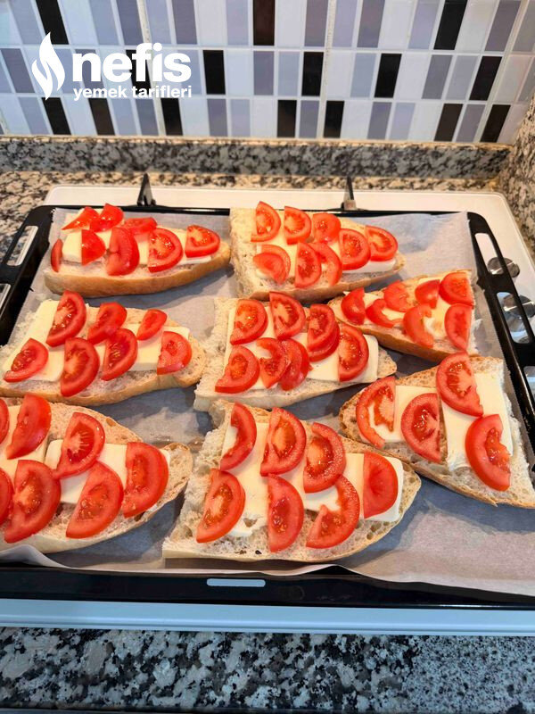 5. Kaşar peynirlerimizi bayat ekmeklerimizin üzerine dizdikten sonra üzerlerine yarım ay şeklinde ve ince dildiğimiz domateslerimizi diziyoruz.