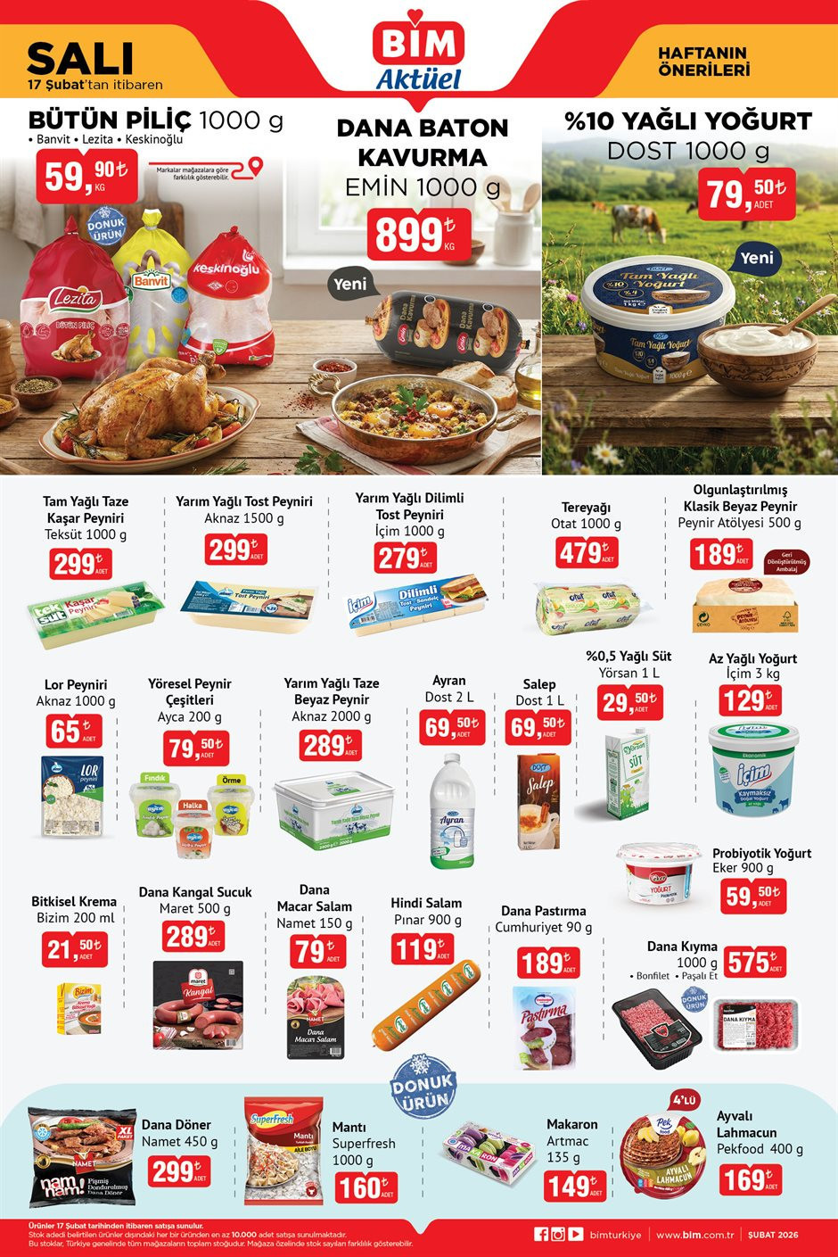 Bim Ramazan afişi raflarda yerini almaya hazırlanıyor. Bim 17 Şubat kataloğu 2026 bu hafta; Banvit Lezita Keskinoğlu Bütün Piliç 1000 gr 59,90 TL, Emin Dana Baton Kavurma 1000 gr 899 TL, Dost %10 Yağlı Yoğurt 1000 gr 79,50 TL, Teksüt Tam Yağlı Taze Kaşar Peyniri 1000 gr 299 TL, Aknaz Yarım Yağlı Tost Peyniri 1500 gr 299 TL, İçim Yarım Yağlı Dilimli Tost Peyniri 1000 gr 279 TL, Otat Tereyağı 1000 gr 479 TL’ den raflarda ve bim online alışveriş sitesi bim.com.tr’de satışa hazır. Peki, bim’de bu hafta indirimli ürünler neler? İşte, bim aktüel ürünler kataloğu 17-20 Şubat 2026 tamamı…