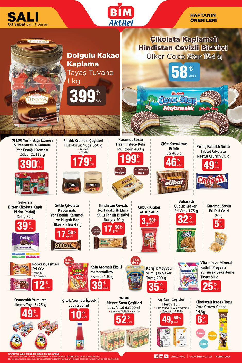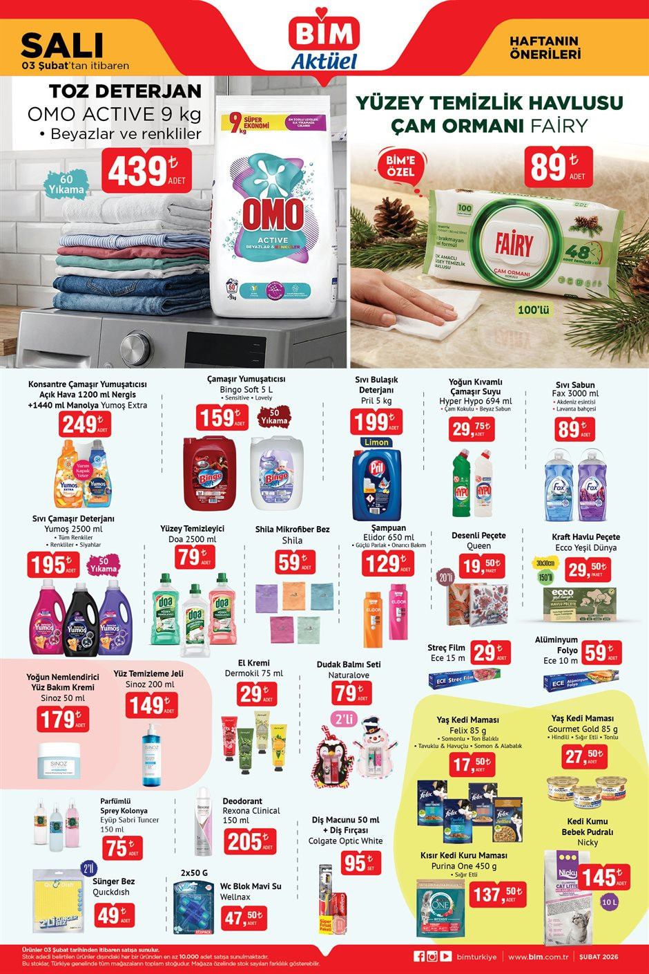 Bim aktüel 3-6 Şubat 2026 kataloğu yayımlandı. Bim 6 Şubat kataloğu 2026 bu hafta; Ören Bayan Star Yumak 32lü 99 TL, Erkek Jogger Pantolon 379 TL, Kappa Sweatshirt 369 TL, Casilli İnce Görünümlü İçi Polar Külotlu Çorap 299 TL, Erkek Eldiven 139 TL, Kadın Pelüş Kep 249 TL ‘ den raflarda ve bim online alışveriş sitesi bim.com.tr’de satışa hazır. Peki, bim’de bu hafta cuma neler var? İşte, bim aktüel ürünler kataloğu 3-6 Şubat 2026 tamamı…