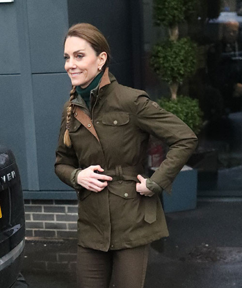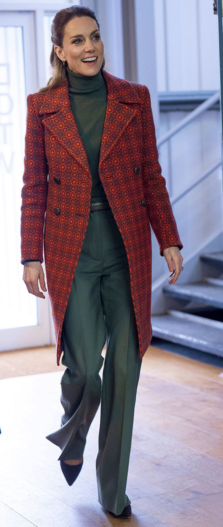 Lambeth Sarayı’ndaki bu ziyaret için Kate, belinde kemeri bulunan koyu toprak renginde bir elbise ve üzerine de uygun renkte bir palto giydi.