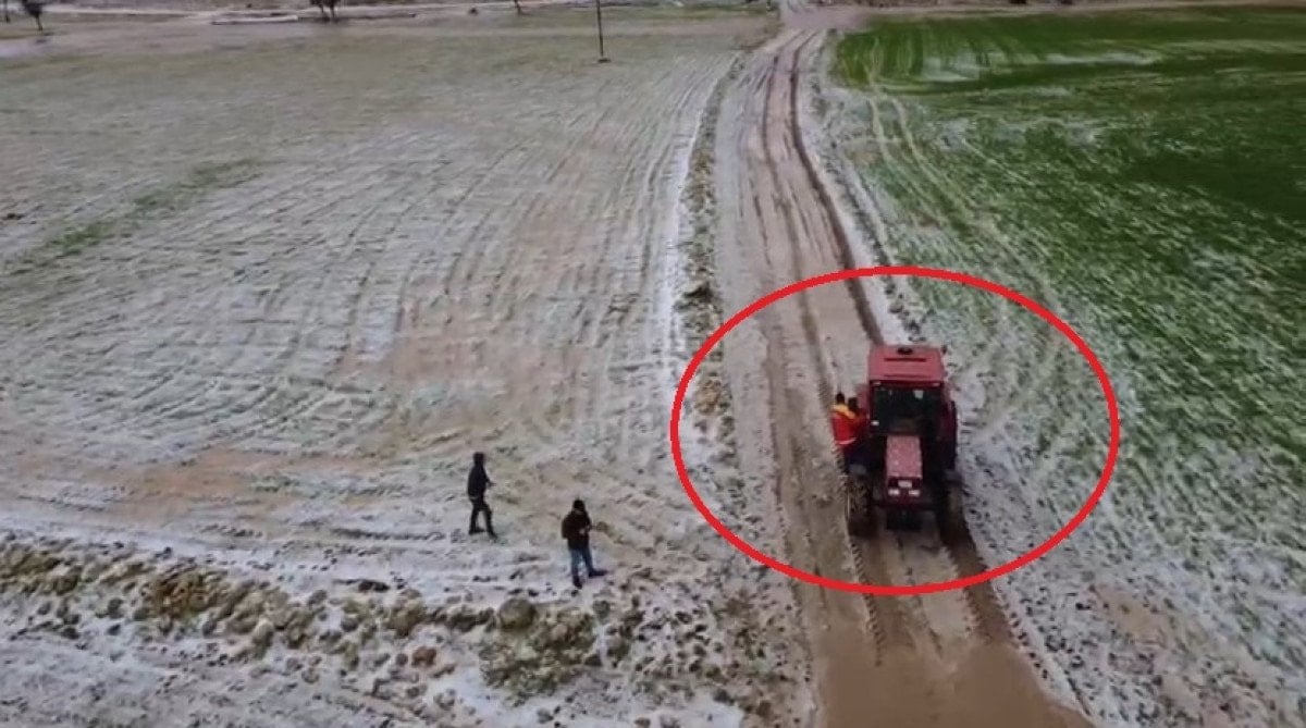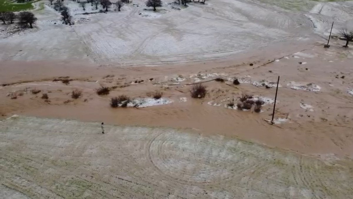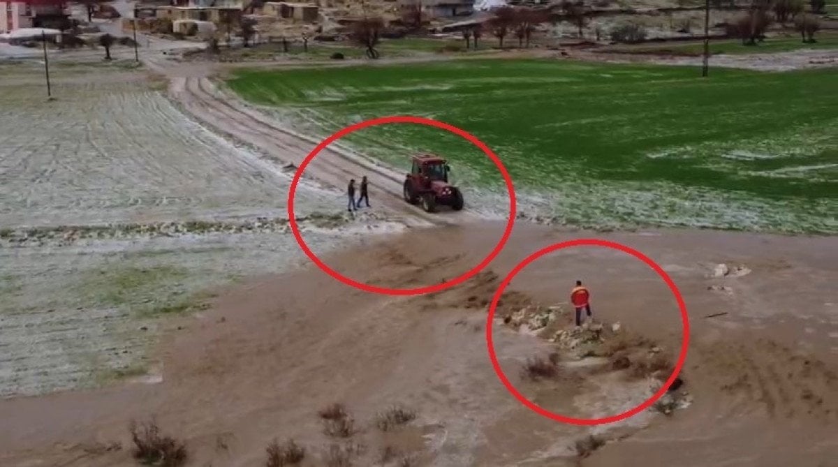 Selde mahsur kalan 1 kişi de traktörle kurtarıldı. Selin etkisi ve kurtarma anları, dronla görüntülendi.