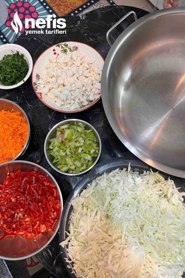 7. Geniş bir tencereye kıyılmış lahanalar eklenir üzerine diğer malzemelerin hepside eklenir.