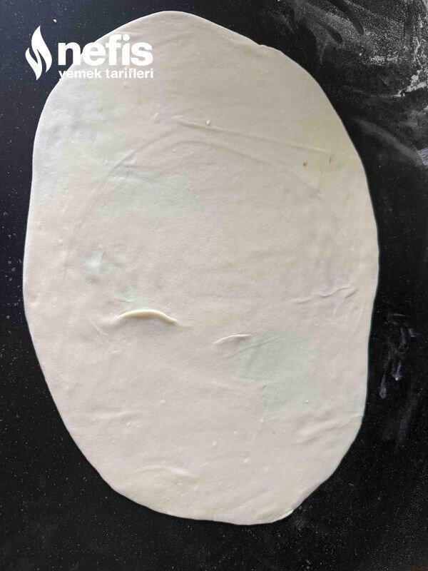 3. Sonra hamurumuzu una batırıp ince olacak şekilde açıyoruz hazırladığımız iç harcından spatula yardımıyla sürüyoruz.