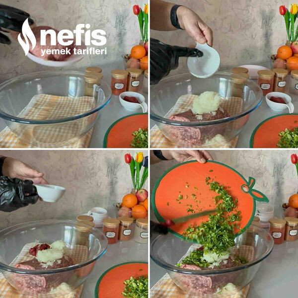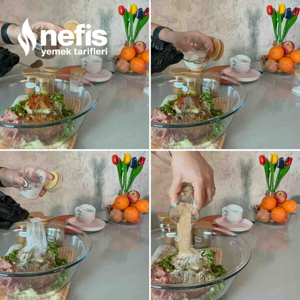 Üzerine rendeleyip suyunu sıktığımız soğanı, yumurtayı, ince kıyım kıydığımız maydanozu, galeta unu ve baharatlarını katıp on beş dakika yoğuralım.