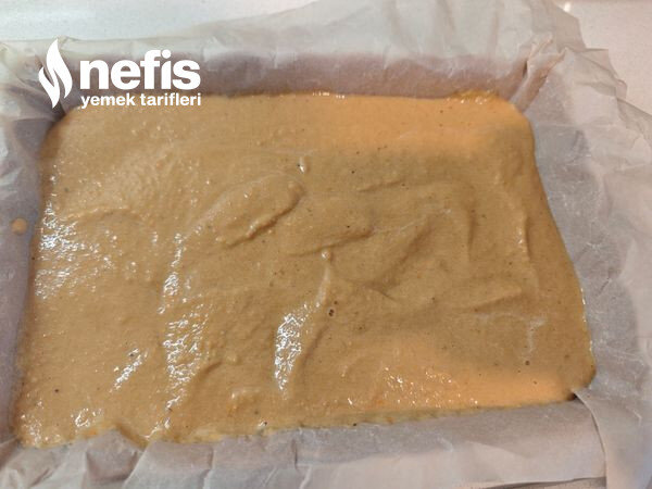3. Kek harcını yağlı kağıt serili yayvan bir kalıba yayın. İsterseniz üzerine file badem serpin.
