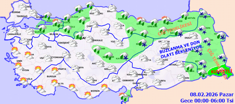 KUVVETLİ YAĞIŞ UYARISI: Yağışların, Doğu Karadeniz kıyıları, Güneydoğu Anadolu’nun doğusu ile İstanbul, Kocaeli, Sakarya, Yalova, Ordu, Hakkari, Bitlis, Bingöl ve Şırnak çevrelerinde yer yer kuvvetli olması beklendiğinden (Bölgede alçak rakıma sahip yerlerde kuvvetli yağış ve kar erimeleri sonucu su baskını, sel ve heyelan, yükseklerde kuvvetli kar yağışlarının oluşturabileceği ulaşımda aksamalar vb.) olumsuzluklara karşı dikkatli ve tedbirli olunması gerekmektedir.