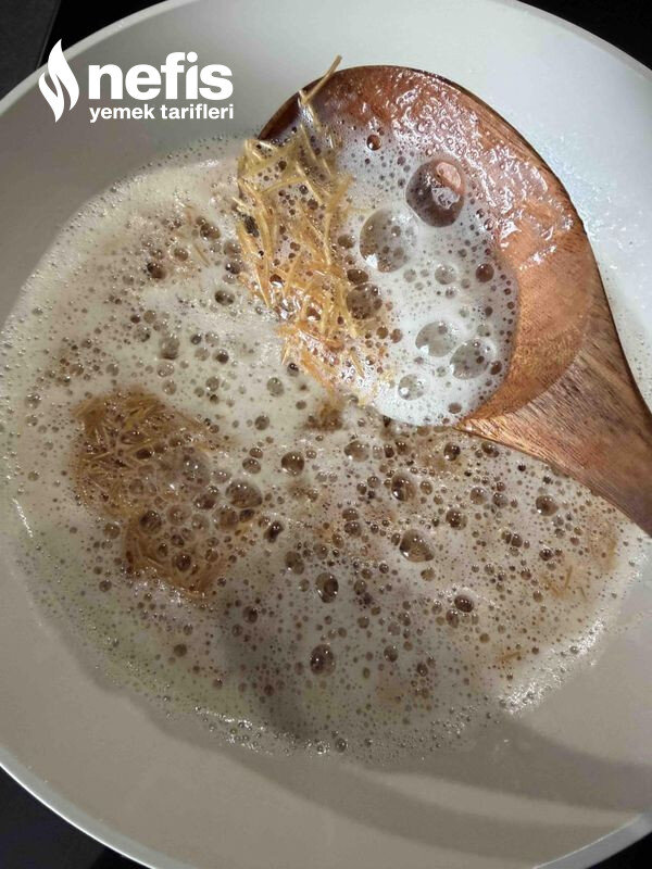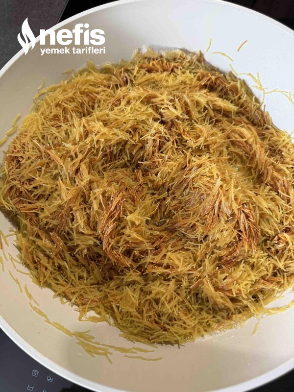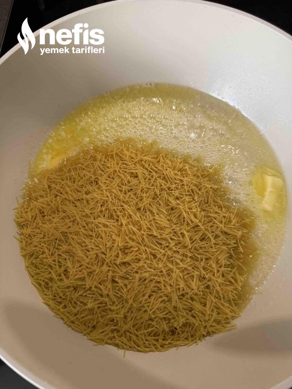 1. İlk olarak sıvı yağ ve tereyağında 1 su bardağı tel şehriye kavrulur. Daha sonra diğer iki bardak tel şehriye eklenir.