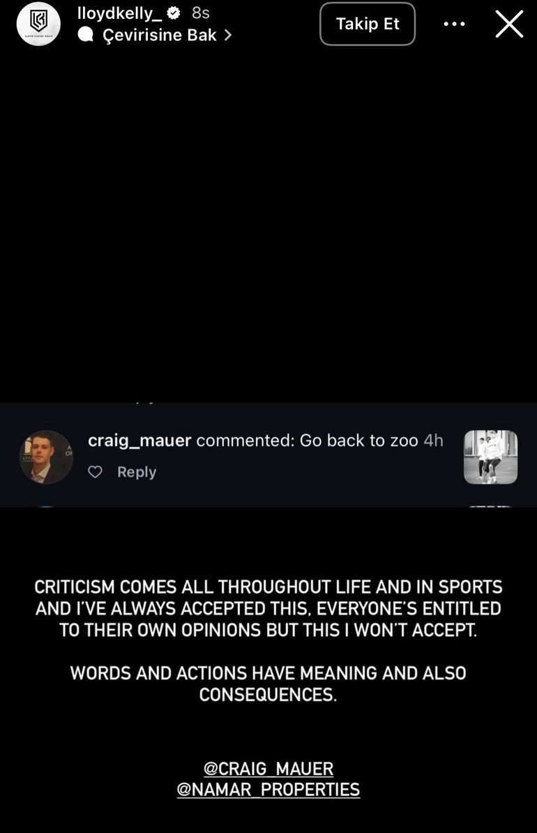 İngiliz savunma oyuncusu, ABD merkezli sosyal medya platformu Instagram’daki hesabında bulunan bir fotoğrafının altına, İtalyan kullanıcılardan birinin “Hayvanat bahçesine geri dön” yönündeki ifadenin ekran görüntüsünü paylaştı.