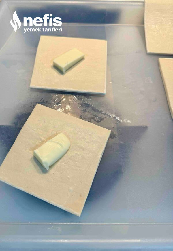 Çözünen milföylerin ortasına ince dilimlenmiş kaşar peynirlerini yerleştirin ve milföyler üçgen olacak şekilde katlayın ve katlanılan milföylerin katladığınız yerlerini elinizle hafifçe bastırın (ki pişerken açılmasın).