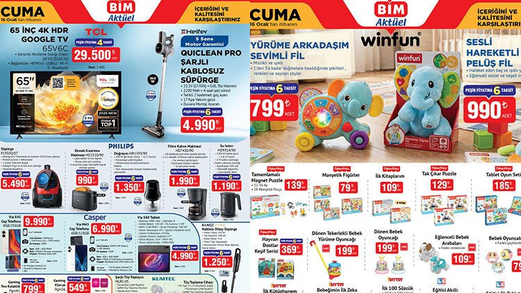 16 Ocak 2026 bim aktüel kataloğu yayımlandı. Bim aktüel bu hafta; Yürüme Arkadaşım Sevimli Fil 799 TL, Sesli Hareketli Pelüş Fil 990 TL, Tamamlamalı Magnet Puzzle 139 TL, Pelüş Lama 559 TL, Kuklalı Hikaye Kitapları 179 TL’ den raflarda ve bim online alışveriş sitesi bim.com.tr’de satışa hazır. Peki, bim’de bu hafta cuma neler var? İşte, Bim aktüel 16 Ocak 2026 bim kataloğu tamamı…