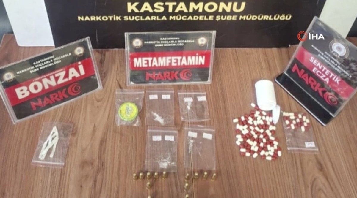 Yapılan aramalarda toplam 19,50 gram metamfetamin, 57,57 gram kannabinoid, 7,24 gram kannabinoid ham maddesi, 67 adet sentetik ecza, 7 adet kilitli poşet, peçeteye emdirilmiş halde 4 parça kannabinoid, 2 adet cam düzenek (payp), 200 mililitre aseton ve 21 adet 9 milimetre çapında tabanca fişeği ele geçirildi.