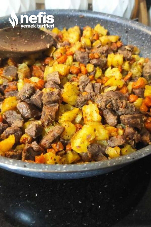 3. Hazır olan et ve sebzeleri bir tavaya alıp sarımsak ile baharatları ekleyelim.