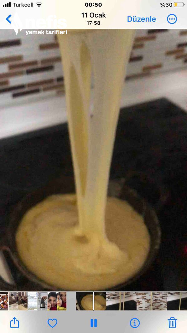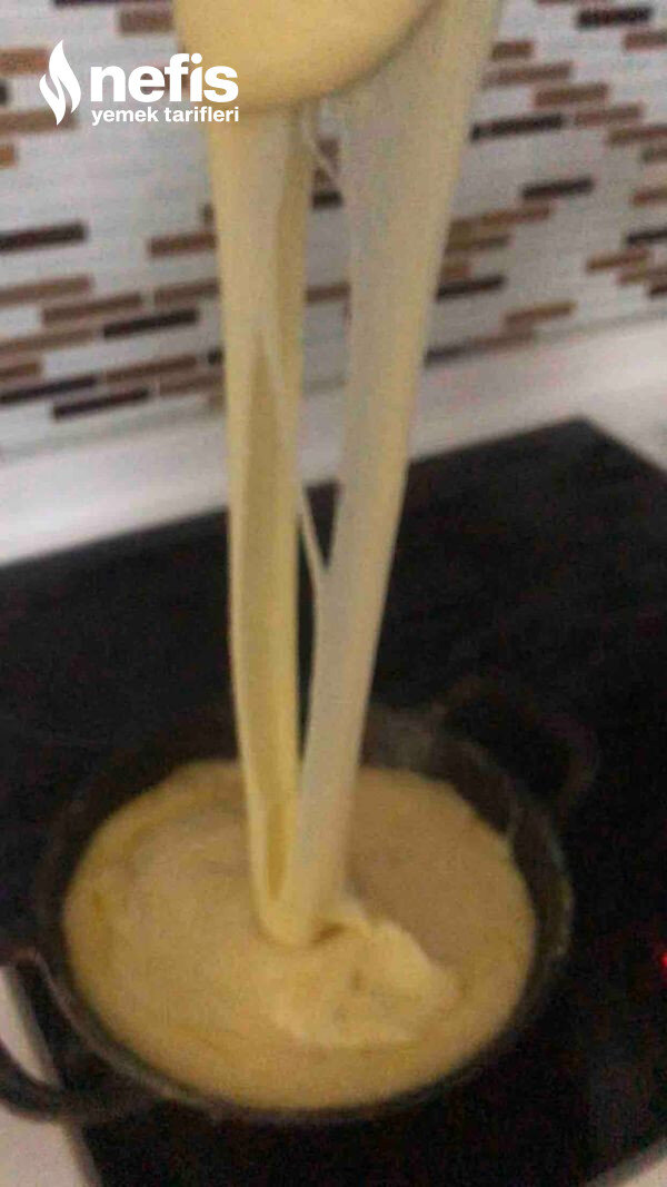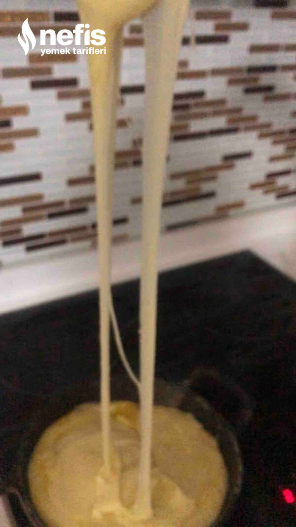 Unumuzun rengi biraz dönmeye başlayınca suyunu ekleyelim kesinlikle sıcak su olmamalı soğuk su olmalı topaklanmaması için sürekli karıştırın eğer peynir tuzsuz ise tuz ekleyin.