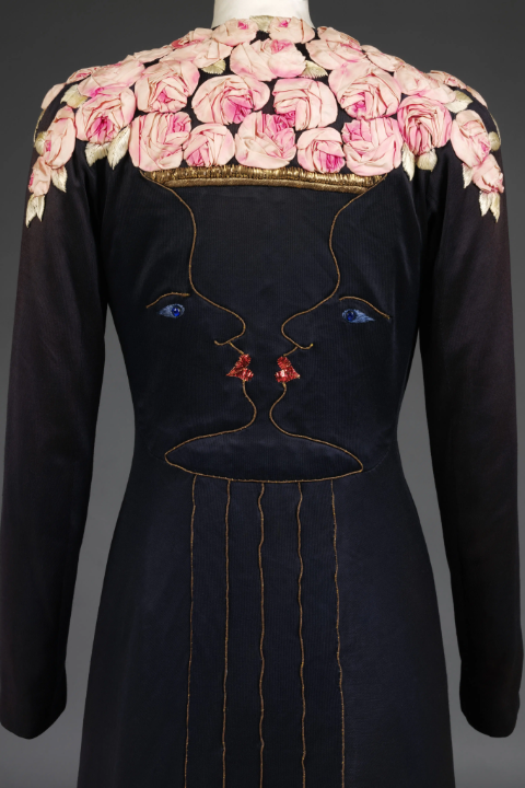 Elsa Schiaparelli’nin 1937 tarihli gece paltosu tam olarak bunu yapar — sizi o sırttaki iki profil gibi karşılar, süzer, içine çeker. Omuzlarda pembe güller, kadifede altın bir çizgi, dudaklar neredeyse birbirine değmek üzeredir.