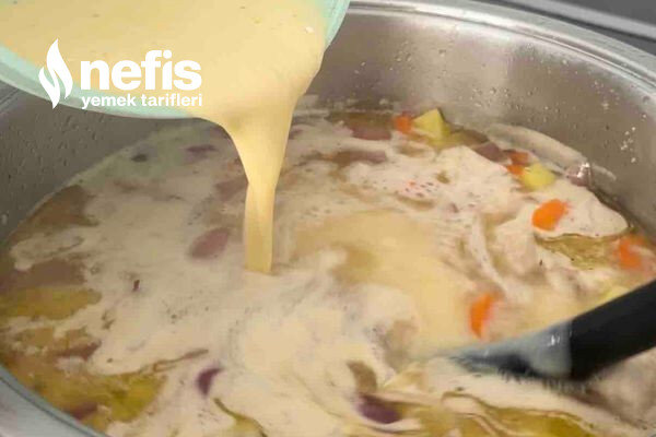 9. Bu karışımı çorbaya yavaşça ekleyin ve sürekli karıştırın.