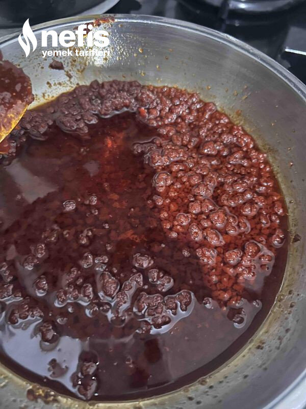 4. Daha sonra uygun bir tavada sıvı yağ ve salçayı kokusu çıkana kadar kavuralım. Onu da soğumaya bırakalım.