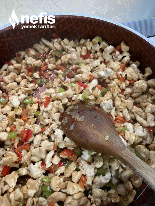 5. Şimdi dikdörtgen bir borcama kreplerimizi koyalım alt tabana 4 tane krep koydum kenarları dışarda kalacak şekilde sonra tavuk soteyi kreplerin üstüne koyup yayalım.