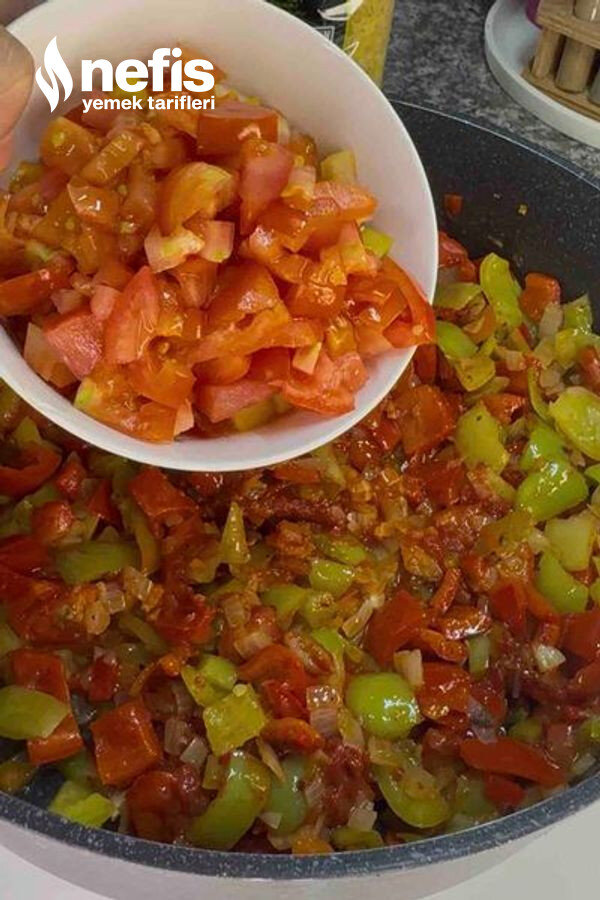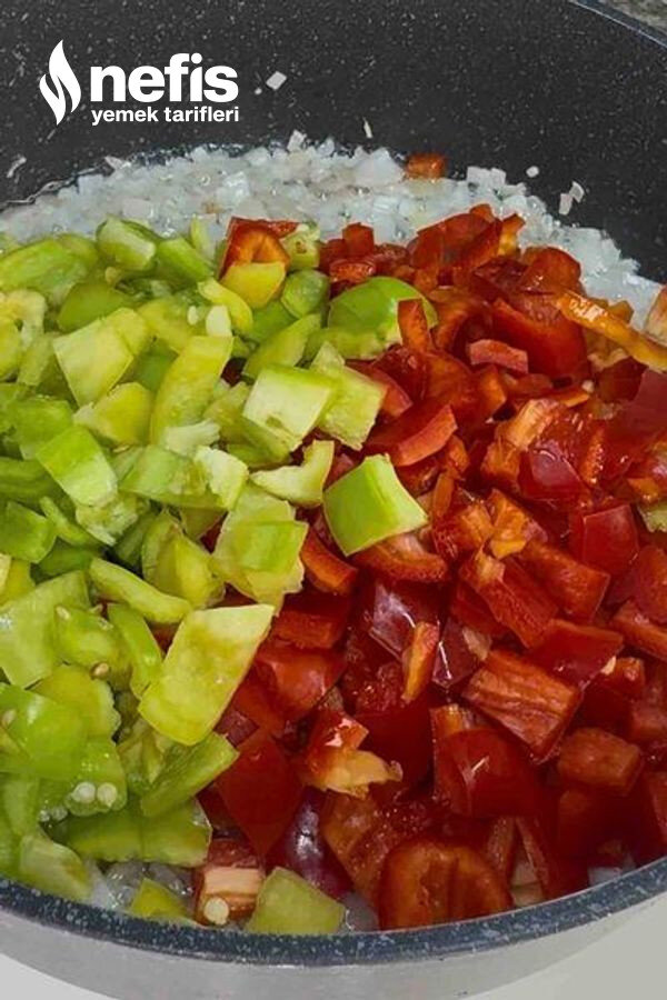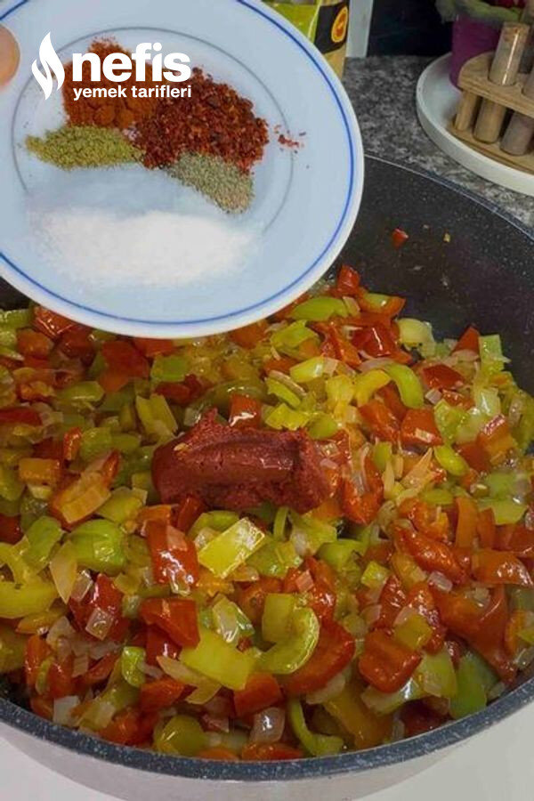 2. Tencerede soğanları kavurun. Biberleri ekleyip soteleyin. Salçaları, doğranmış domatesleri ve baharatları ilave edin.