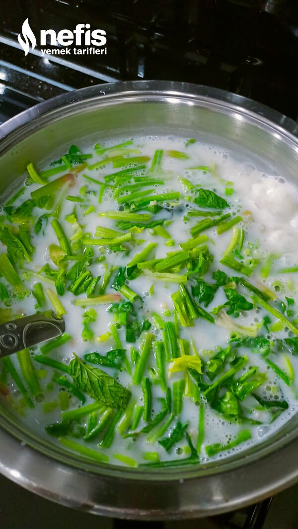 2. 5 litrelik tencereye yoğurt, un ve suyu ekleyip çırpıyoruz kaynayana kadar karıştırıyoruz ki kesilmesin.