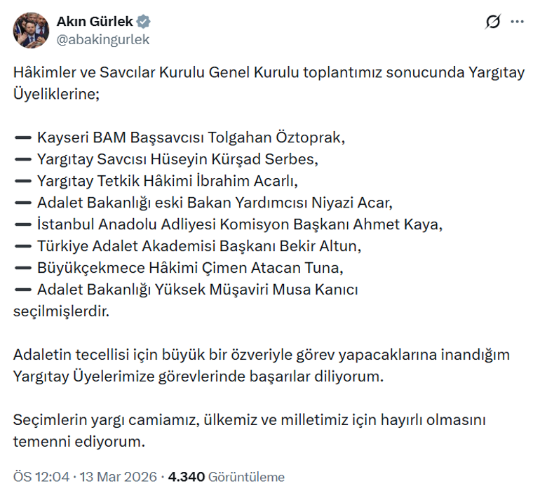 Adalet Bakanı Akın Gürlek, NSosyal hesabından yaptığı paylaşımda, “Adaletin tecellisi için büyük bir özveriyle görev yapacaklarına inandığım Yargıtay üyelerimize görevlerinde başarılar diliyorum. Seçimlerin yargı camiamız, ülkemiz ve milletimiz için hayırlı olmasını temenni ediyorum.” ifadelerini kullandı.