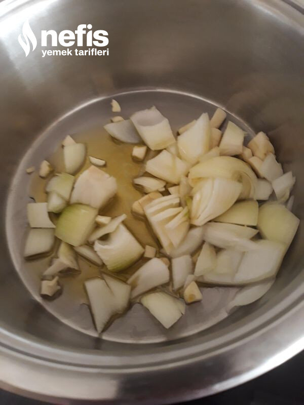6. Uygun bir tencereye zeytin yağı alınır ısıtılır, doğranan soğan, sarımsaklar alınır orta harlı ocakta kavrulur, üzerine havuç eklenir kavrulur, biberler eklenir kavrulur, bir tatlı kaşığı tepeleme un eklenir karıştırılır.